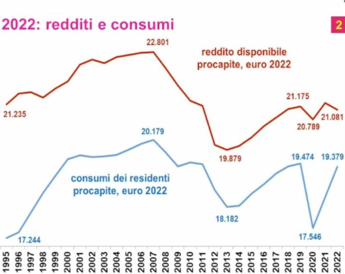 Confcommercio spiega che : “una frazione della riduzione delle intenzioni di acquisto è data dal fatto che sia per le ristrutturazione, sia per i durevoli per la casa sia per le automobili, molte spese rilevanti sono state fatte da poco e quindi è logico non prevederne altro”. Il circuito spese-intenzioni-spese agisce come un effetto rimbalzo, ma ciò non toglie che potenzialmente sia negativo per le prospettive dei consumi nei prossimi mesi e, quindi, potrebbe implicare un rallentamento della ripresa. Per interpretare al meglio il sentiment e le attese delle famiglie occorre ricordare che nel 2022, a prezzi costanti, non è stato recuperato né il reddito disponibile pro capite del 2019 né, tantomeno, quello del 2007, cioè il massimo. Siamo addirittura sotto di 150 euro in termini reali rispetto al 1995, cioè quasi trent’anni fa. I trent’anni di bassa crescita si sentono nelle nostre tasche e nei temi di disagio sociale e crescita della povertà assoluta. Grazie alla crescita della propensione al consumo, nel lungo periodo la spesa reale è andata un po’ meglio del reddito: abbiamo recuperato quasi i livelli del 2019 ma siamo sotto i massimi del 2007 ancora di 800 euro a testa. Per leggere e capire il post-pandemia bisogna ricordare gli ingenti aiuti pubblici. Confcommercio ricorda che nel 2020 i consumi sono calati molto più del reddito disponibile reale, e questo ha generato risparmio in eccesso, diciamo non desiderato; e poi a fronte di redditi solo moderatamente crescenti nel biennio 2021-2022 c’è stato il quasi recupero dei consumi: si capisce, quindi che è stato sostento da quel risparmio a sua volta generato dai trasferimenti e dai sostegni pubblici che hanno funzionato. Analoghe indicazioni si desumono sulla propensione alle vacanze estive: dopo la pandemia c’è stato un ritorno importante; ora si è ancora su propensioni elevate ma in leggera riduzione rispetto al 2022: dai durevoli ai servizi, l’ipotesi di rallentamento sia verosimile, fenomeno che implicherebbe il rallentamento complessivo del 2023, sebbene sia esclusa la recessione.