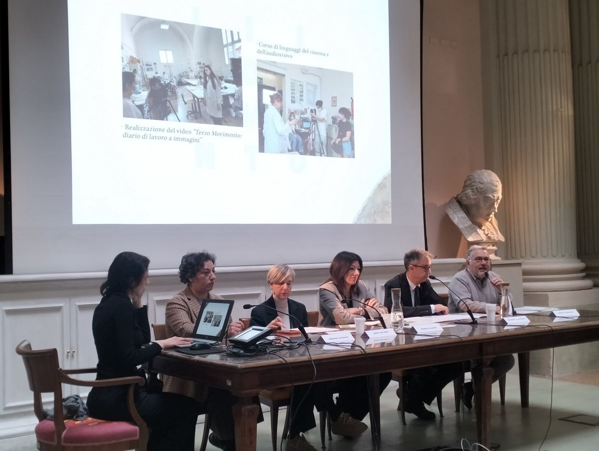 Presenti Gessica Allegni, assessora regionale alla Cultura; Sergio Brancato ed Enrico Fornaroli, rispettivamente presidente e direttore dell’Accademia di Belle Arti di Bologna; Anna Lisa Boni, assessora Missione Clima, Relazioni Internazionali e Portici Unesco del Comune di Bologna; Adriana Locascio, presidente Quartiere San Vitale e San Donato di Bologna; Giuseppe Antonio Panzardi, dirigente Ufficio scolastico regionale per l’Emilia-Romagna dell’Ambito territoriale di Bologna; Antonella Salvi, ideatrice e referente del programma operativo “Tre Istituzioni e un Patrimonio” per la Regione, Settore Patrimonio culturale, e Camilla Roversi Monaco, coordinamento interno per l’Accademia di Belle Arti di Bologna.