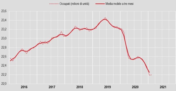 Il livello dell’occupazione nel trimestre dicembre 2020-febbraio 2021 è inferiore dell’1,2% rispetto a quello del trimestre precedente (settembre-novembre 2020), con un calo di 277mila unità. Nel trimestre aumentano sia le persone in cerca di occupazione (+1,0%, pari a +25mila), sia gli inattivi tra i 15 e i 64 anni (+1,3%, pari a +183mila unità).