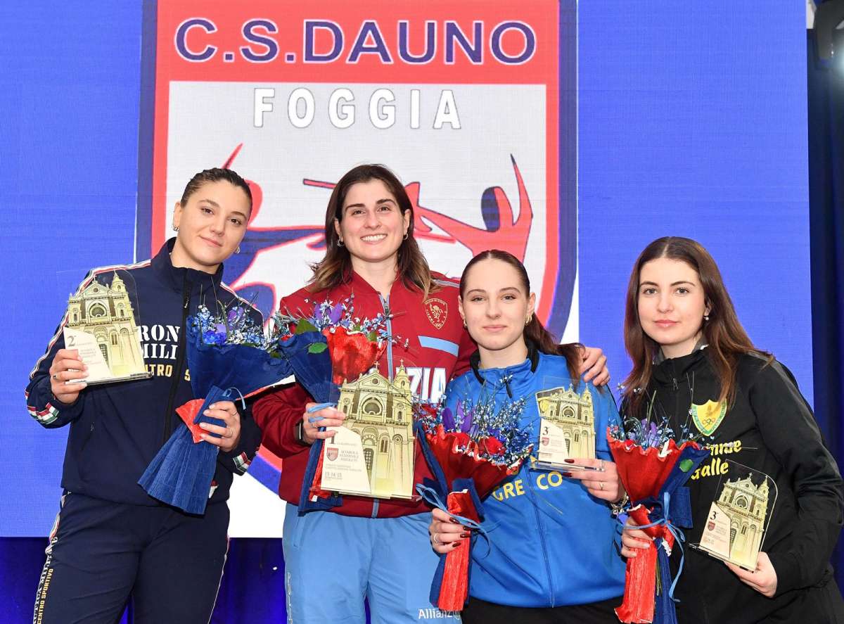 Medaglie di bronzo per Manuela Spica del Gruppo Scherma Fiamme Gialle (superata in semifinale da Rotili) e per Vittoria Mocci dell’Accademia d’Armi Musumeci Greco (fermata dalla vincitrice) che è la più giovane delle medagliata da “classe 2009”.
