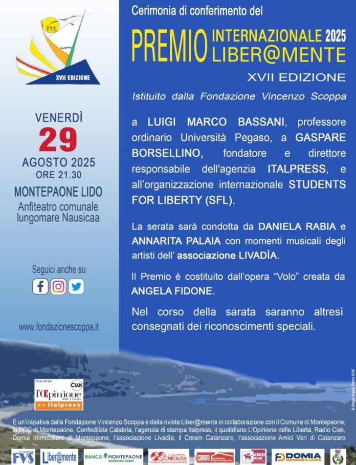 CATANZARO (ITALPRESS) – Il 29 agosto 2025, alle ore 21.30, a Montepaone Lido (Anfiteatro comunale – Lungomare Nausicaa) si terrà la XVII edizione del Premio Internazionale Liber@mente, promosso dalla Fondazione Vincenzo Scoppa. I riconoscimenti saranno conferiti a Luigi Marco Bassani, professore ordinario di Storia delle dottrine politiche all’Università Pegaso, a Gaspare Borsellino, fondatore e direttore responsabile dell’agenzia di stampa Italpress, e all’organizzazione internazionale Students For Liberty (SFL), la più grande rete mondiale di studenti impegnati nella promozione delle idee di libertà.