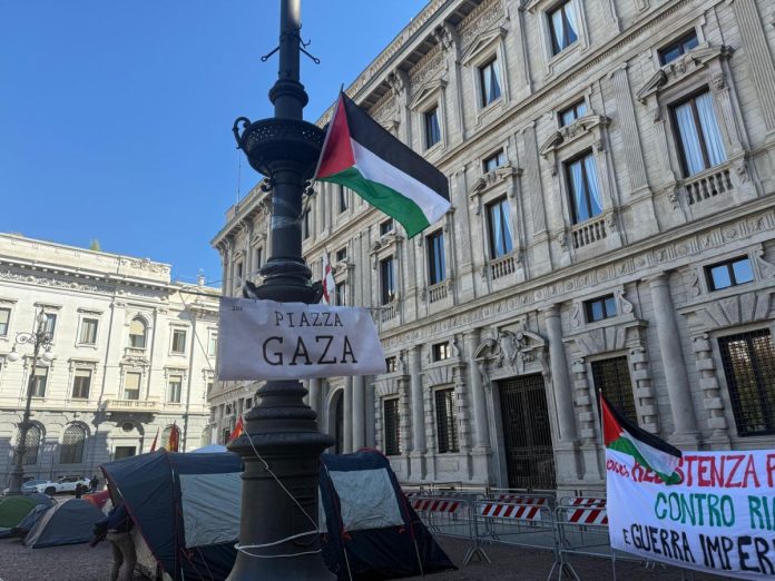 MILANO (ITALPRESS) – Da ieri è in corso in Piazza della Scala, a Milano, il presidio permanente promosso dall’Unione Sindacale di Base (USB), che ha ribattezzato lo spazio “Piazza Gaza”. Accanto alle tende del sindacato, sono presenti quelle di associazioni palestinesi, Potere al Popolo e collettivi studenteschi come Cambiare Rotta e Osa. Le realtà coinvolte chiedono la fine dell’offensiva a Gaza, la sospensione dei rapporti economici e istituzionali con Israele e la tutela della Global Sumud Flotilla. USB sollecita inoltre il sindaco Sala e il Consiglio comunale a interrompere il gemellaggio di Milano con Tel Aviv, come gesto concreto contro le violenze.
