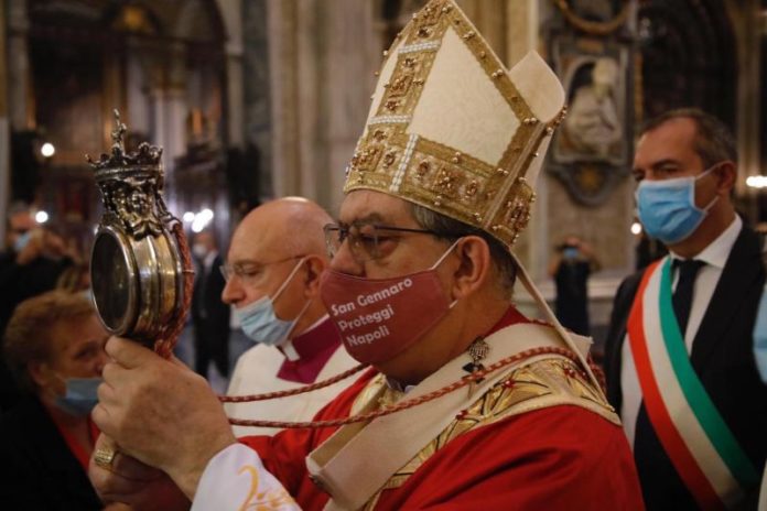 NAPOLI (ITALPRESS) – Alle 10,02 si è ripetuto a Napoli il prodigio del “miracolo” di San Gennaro. All’interno del Duomo della città partenopea è avvenuta la liquefazione del sangue del santo. Ad annunciarlo l’arcivescovo, il cardinale Crescenzio Sepe. “Il sangue – ha annunciato Sepe – si è completamente sciolto, senza alcun grumo, segno di amore e vicinanza di San Gennaro”. A salutare il prodigio, in un Duomo con pochi fedeli a causa delle restrizioni sul Covid, il capo della Deputazione di San Gennaro che ha sventolato, come vuole la tradizione, il fazzoletto bianco.