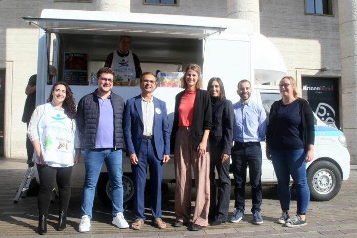 Taglio del nastro in piazzale della Stazione assieme al presidente di Progetto Arca Onlus Alberto Sinigallia, al vicesindaco Andrea Micalizzi, all’assessora alle Politiche sociali Margherita Colonnello, alla presidente dell’associazione Noi sulla Strada Francesca Simonini, al presidente della cooperativa sociale Cosep Salvatore Russotto e a Lorenzo Fronteddu, Corporate Affairs & Communications Director di JTI Italia.