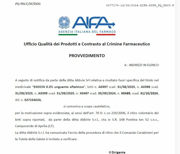 “A seguito di notifica da parte della ditta Abbvie Srl relativa a risultato fuori specifica del titolo nel medicinale “EXOCIN 0.3% unguento oftalmico”, lotti n. A0397 scad. 31/08/2025, n. A0398 scad. 31/08/2025, n. A0399 scad. 31/08/2025, n. X0487 scad. 30/09/2024, n. X0489, scad. 31/10/2024, AIC n. 027234020, si comunica a scopo cautelativo, per la motivazione sopra evidenziata, ai sensi dell’art. 70 D. L.vo 219/2006, il ritiro volontario dei lotti sopra riportati, da parte della ditta AbbVie S.r.l., sita in S.R. 148 Pontina km 52 s.n.c., Campoverde di Aprilia (LT)”, si legge in una nota dell’Aifa.