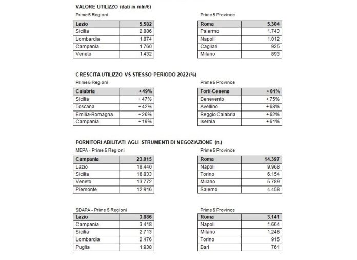 A livello territoriale, emerge che: il Lazio è la regione che ha fatto il maggior ricorso agli strumenti di e-procurement, con un valore che si avvicina ai 5,6 miliardi di euro. A livello provinciale, il primato spetta a Roma che da sola registra un valore di 5,3 miliardi di euro. La Calabria è la regione con la più alta crescita nell’utilizzo degli strumenti pari a +49% (rispetto allo stesso periodo del 2022), mentre a livello provinciale Forlì-Cesena (+81%). La Campania è la regione con il maggiore numero di fornitori abilitati al Mepa con 23.015 imprese, mentre tra le province la classifica è guidata da Roma con 14.397 imprese. Il Lazio è la regione con il maggiore numero di fornitori abilitati allo Sdapa con 3.386 imprese, mentre la prima provincia è ancora una volta Roma con 3.141 imprese.