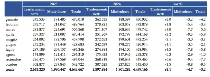 I trasferimenti netti cedono l’1,5%, mentre le minivolture segnano un +0,8%. Nei primi 10 mesi la crescita è del 3,2% con 4.643.667 trasferimenti (in linea con il 2019). Fra le motorizzazioni il motore a benzina, con una quota del 39,3% (-0,1 punti percentuali) mantiene il 1° posto anche in ottobre (38,6% nei 10 mesi).