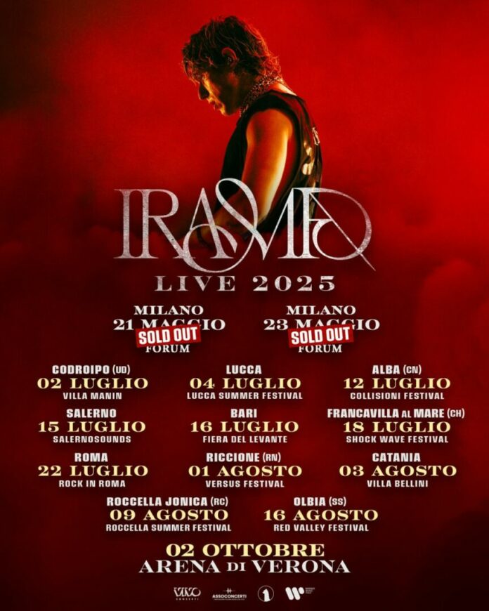 Il tour partirà il 2 luglio da Codroipo (UD), Villa Manin, per poi proseguire venerdì 4 luglio a Lucca con un appuntamento al Lucca Summer Festival in Piazza Napoleone. Sabato 12 luglio sarà la volta di Alba, con un live al Collisioni Festival, seguito da Salerno il 15 luglio in Piazza della Libertà e Bari il 16 luglio alla Fiera del Levante. Il 18 luglio Irama sarà protagonista a Francavilla al Mare (CH), sul palco dello Shock Wave Festival. Martedì 22 luglio salirà sul palco del Rock in Roma all’Ippodromo delle Capannelle, mentre venerdì 1 agosto sarà a Riccione per il Versus Festival. Il tour proseguirà il 3 agosto a Catania (Villa Bellini), il 9 agosto a Roccella Jonica (RC) al Roccella Summer Festival, per poi toccare il 16 agosto a Olbia (SS), sul palco del Red Valley Festival presso l’Olbia Arena.