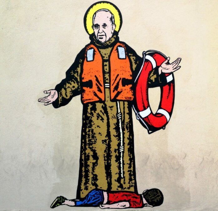Ai suoi piedi, il corpo senza vita del piccolo Alan Kurdi, il bambino siriano diventato simbolo globale della tragedia migratoria. L’immagine è dura ma necessaria: tipica dello stile Palombo che non lascia mai spazio all’indifferenza. Come una Pietà contemporanea, Papa Francesco accoglie il corpo del piccolo Alan Kurdi come Maria il Figlio: un’icona urbana che eleva la compassione al rango di gesto sacro, Francesco si fa ponte tra l’umano e il sacro, protettore degli ultimi e testimone silenzioso del dolore del mondo. L’opera viene svelata nei giorni dei Novendiali, mentre la Chiesa universale si prepara a eleggere un nuovo Pontefice. La scelta non è casuale: aleXsandro Palombo sceglie il tempo del lutto e della riflessione per imprimere nel tessuto urbano una memoria visiva forte, indelebile.
