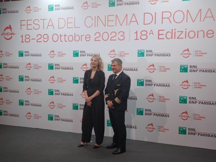 – foto ufficio stampa Ita Airways – Nella foto Margherita Buy insieme al Comandante Riccardo Privitera, Direttore Operazioni Volo-