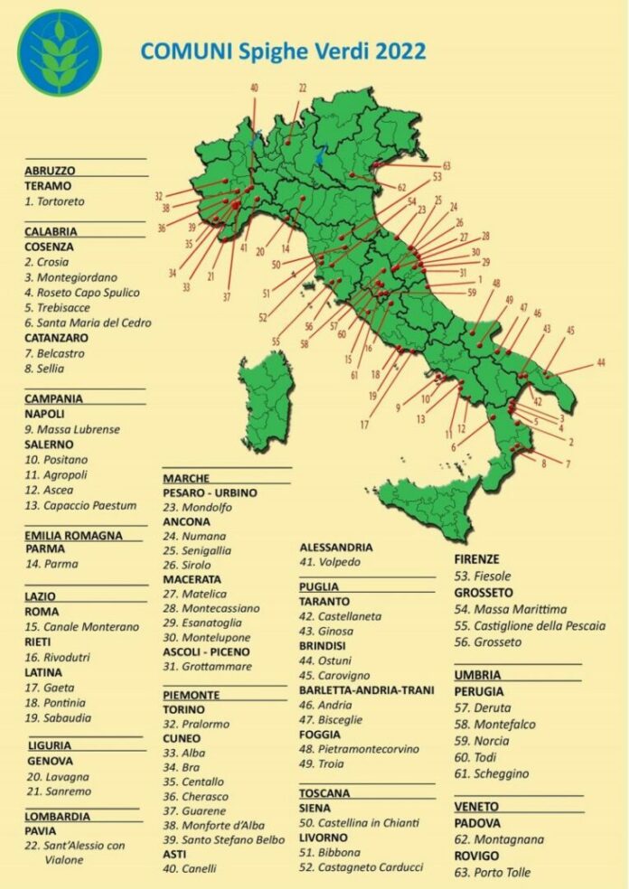 Alcuni indicatori presi in considerazione sono stati: la partecipazione pubblica; l’educazione allo sviluppo sostenibile; il corretto uso del suolo; la presenza di produzioni agricole tipiche; la sostenibilità e l’innovazione in agricoltura; la qualità dell’offerta turistica; l’esistenza e il grado di funzionalità degli impianti di depurazione; la gestione dei rifiuti con particolare riguardo alla raccolta differenziata; la valorizzazione delle aree naturalistiche eventualmente presenti sul territorio e del paesaggio; la cura dell’arredo urbano; l’accessibilità per tutti senza limitazioni. Questi sono solo alcuni degli indicatori che guidano il programma e che saranno suscettibili di variazioni, in un’ottica di miglioramento continuo e di massimo coinvolgimento dei Comuni italiani. Confermato anche quest’anno tra gli indicatori AGRIcoltura100, realizzato da Confagricoltura e Reale Mutua che premia le aziende sostenibili. “Anche quest’anno registriamo un incremento nel numero di Comuni che hanno ottenuto le Spighe Verdi con 7 nuovi ingressi – dichiara Claudio Mazza, presidente della FEE Italia -. Un segnale che mostra chiaramente la decisa volontà di amministratori e cittadini di farsi trovare pronti davanti alle sfide che la transizione impone. In un momento in cui le amministrazioni sono chiamate a confrontarsi anche con calamità naturali, brusche variazioni climatiche, emergenze ambientali e sanitarie, un Comune certificato Spiga Verde possiede certamente una modalità di lavoro e di gestione del territorio, in cui tutti sono protagonisti di buone pratiche ambientali e comportamenti virtuosi che non solo fanno la differenza ma che nel tempo rendono possibile quel cambiamento culturale di cui abbiamo bisogno”, aggiunge. “Aumenta anche quest’anno il numero dei Comuni candidati a Spighe Verdi, il riconoscimento alle realtà virtuose delle aree rurali, come avviene per le Bandiere Blu nelle località marittime – afferma Massimiliano Giansanti, presidente di Confagricoltura -. Sono orgoglioso che, attraverso il programma di FEE, al quale collaboriamo con convinzione sin dalla prima edizione, venga compreso e certificato il valore del lavoro degli agricoltori. Il premio attesta la capacità del settore, che ha contribuito a conservare e valorizzare i comuni a forte vocazione agricola, come attrazione turistica, culturale ed enogastronomica. Realtà ‘verdì in grado d’innovarsi, di essere attente alla sostenibilità e alla cura del territorio, presidiandolo e assicurando una corretta gestione ambientale, turistica, culturale ed enogastronomica, tanto da meritarsi questo importante riconoscimento”.Le Spighe Verdi 2022 sono state assegnate in 13 Regioni. Il Piemonte ottiene il maggior numero di riconoscimenti con 10 Spighe Verdi: Alba, Bra, Canelli, Centallo, Cherasco, Guarene, Monforte d’Alba, Pralormo, Santo Stefano Belbo, e Volpedo. Subito dopo le Marche, con 9 località premiate: Esanatoglia, Grottammare, Matelica, Mondolfo, Montecassiano, Montelupone, Numana, Senigallia, Sirolo. Aumentano i riconoscimenti in Puglia con 8 Comuni Spighe Verdi: Andria, Bisceglie, Castellaneta, Carovigno, Ginosa, Ostuni, Pietramontecorvino, Troia. Segue la Toscana con 7 riconoscimenti: Bibbona, Castellina in Chianti, Castiglione della Pescaia, Castagneto Carducci, Fiesole, Grosseto, Massa Marittima. Con 7 località segue la Calabria: Belcastro, Crosia, Montegiordano, Roseto Capo Spulico, Santa Maria del Cedro, Sellia, Trebisacce. Arriva a 5 il numero delle Spighe Verdi in Umbria: Deruta, Montefalco, Norcia, Scheggino, Todi. Sono 5 le località del Lazio: Canale Monterano, Gaeta, Pontinia, Rivodutri, Sabaudia. Anche la Campania ottiene 5 riconoscimenti: Agropoli, Ascea, Capaccio Paestum, Massa Lubrense, Positano. Il Veneto vanta due località: Montagnana e Porto Tolle. Anche in Liguria i Comuni sono due: Lavagna e Sanremo. Vi è un Comune rurale Spiga Verde in Abruzzo (Tortoreto), in Emilia-Romagna (Parma), in Lombardia (Sant’Alessio con Vialone).