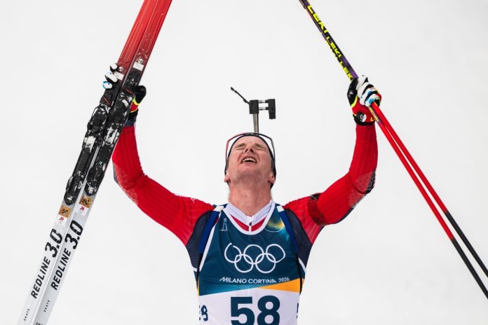 Mandatory Credit: Photo by MATHIAS BERGELD/BILDBYRÅN/Shutterstock (16538106bb) Johan-Olav Botn of Norway celebrates after competing men's biathlon 20 km individual during day 4 of the 2026 Winter Olympics on February 10, 2026 in Anterselva. 2026 Winter Olympics, Day 4, Biathlon, Men's 20 km, Anterselva, Italy - 10 Feb 2026