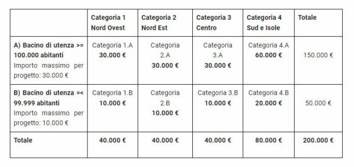 I 200mila euro stanziati da Biorepack saranno ripartiti per 4 fasce territoriali (Nord Ovest, Nord Est, Centro, Sud e Isole) e 2 bacini di utenza (maggiori o minori di 100.000 abitanti).