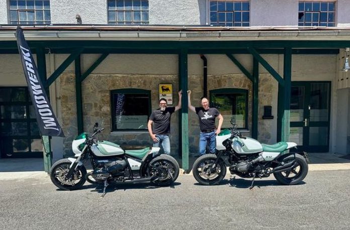 Questo non solo ha migliorato l’aspetto sportivo della moto, ma ha anche notevolmente potenziato le performance di frenata. Numerosi componenti – dai supporti della carenatura alla scatola del fanale posteriore, fino al caratteristico cappuccio finale del forcellone con porta targa integrato – sono stati progettati su misura, attraverso processi di fresatura CNC o di stampa 3D. Anche gli indicatori e le luci posteriori montati sul forcellone sono frutto dello sviluppo inhouse di [WOIDWERK] a testimonianza dell’attenzione per i dettagli. Il sistema di scarico, rivestito in ceramica nera da Hattech, regala un suono pieno e profondo che si coniuga perfettamente con le linee muscolose della moto. Come per la R 12, la sella in pelle e Alcantara con cuciture a vista è stata realizzata su misura da Zinteriors. Entrambe le moto condividono una distintiva combinazione di colori che simboleggia le stagioni della foresta bavarese: 3/4 bianco e 1/4 verde, un richiamo ironico al lungo inverno della regione.