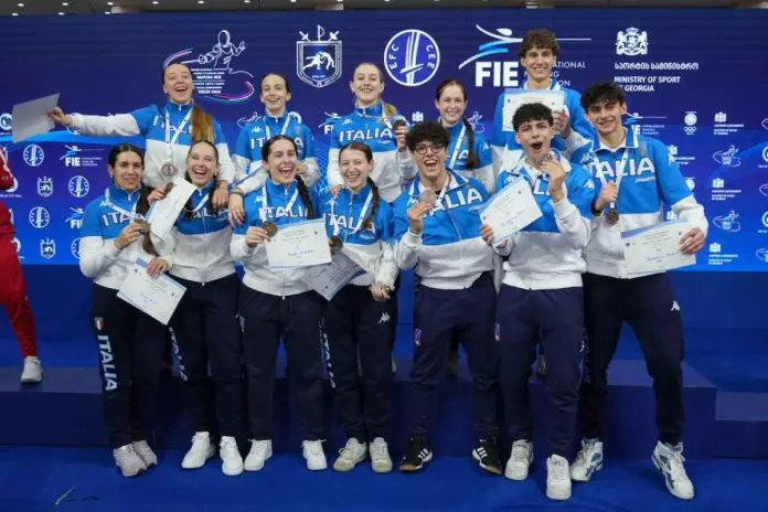 Doppio trionfo al femminile per l’Italia che si laurea campione d’Europa con le formazioni delle fiorettiste e delle sciabolatrici, mentre sale sul terzo gradino del podio il team degli spadisti. Suona due volte l’Inno di Mameli in Georgia, in un pomeriggio dalle grandi emozioni: Maria Elisa Fattori, Martina Molteni, Gloria Pasqualino ed Elena Picchi portano il Tricolore in cima al Vecchio Continente nel fioretto femminile, e lo stesso fanno Vittoria Mocci, Anna Torre, Vittoria Fusetti e Matilde Reale nella sciabola femminile, in due gare a squadre letteralmente dominate. Ma di grande valore è anche il bronzo di Pietro de Gaetano, Andrea Bossalini, Gabriele Giovita e Valentino Monaco nella spada maschile. Ancora regine d’Europa le azzurrine del fioretto, seppure con una squadra quasi tutta nuova: Maria Elisa Fattori, unica presente un anno fa ad Antalya, Martina Molteni, Gloria Pasqualino ed Elena Picchi hanno avuto un percorso esaltante, fatto di compattezza e vittorie.