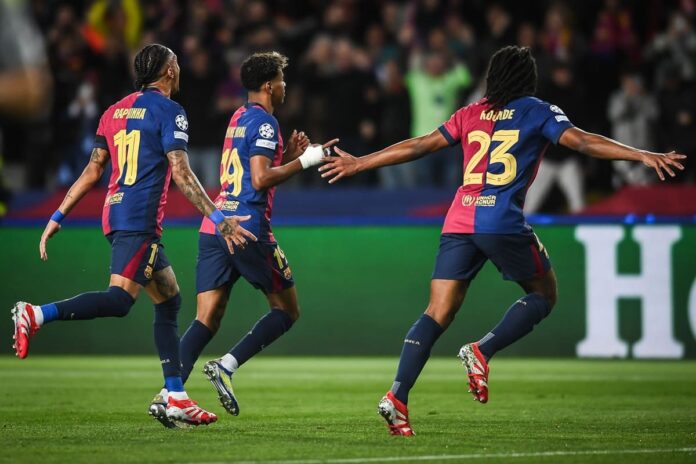 Per primi in ordine di tempo, i ragazzi di Flick bissano il successo dell’andata e piegano per 3-1 il Benfica sulla collina del Montjuic. Allo Stadio Olimpico incanta tutti con le sue giocate Lamine Yamal (un gol e un assist), ma serve anche la concretezza di Raphihna che ne fa 2 e arriva a quota 11 reti europee. Per i portoghesi c’è solo il lampo di Otamendi. Un minuto di silenzio per il medico del Barcellona, stroncato da un infarto a poche ore dal match di sabato (poi rinviato) con l’Osasuna, e si parte con i catalani subito padroni del campo. Trubin blocca a terra il primo tiro della gara di Yamal e questa sarà una delle rare volte nella serata in cui qualcuno riuscirà a fermare il 17enne spagnolo che al minuto 11′ propizia il vantaggio dei suoi: serpentina palla al piede dalla destra e suggerimento perfetto dall’altro lato dove Raphinha non può sbagliare. La reazione del Benfica è pressoché immediata, bastano due giri di orologio per arrivare all’1-1. Angolo di Schjelderup e testa sotto porta di Otamendi: Szczesny tocca ma non trattiene.