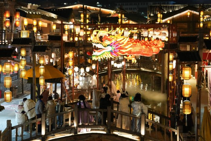 HENGYANG (CINA) (XINHUA/ITALPRESS) – I turisti si divertono a Nanyueli, un’area gastronomica e culturale nel distretto di Nanyue a Hengyang, nella provincia centrale cinese dello Hunan, il 9 gennaio 2026. Integrando diverse tipologie di attività come ristorazione, ospitalità alberghiera, fotografia di viaggio e spettacoli, Nanyueli offre ai turisti esperienze di viaggio diversificate. Negli ultimi anni, il governo locale ha creato nuovi scenari e forme di business per rilanciare l’economia della notte, facendo leva sulle risorse storiche e culturali