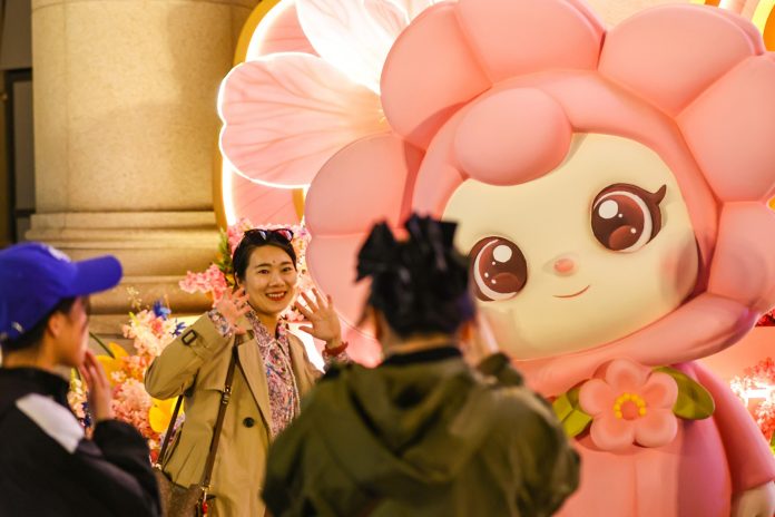 TIANJIN (CINA) (XINHUA/ITALPRESS) – Una turista posa per una foto con Tang Tang, la mascotte di un festival dei fiori di melo selvatico, nell’area urbana storica di Wudadao a Tianjin, nel nord della Cina, il 3 aprile 2026. Il festival si sta svolgendo qui dal 3 fino al 12 aprile, dando impulso all’industria culturale e turistica locale.