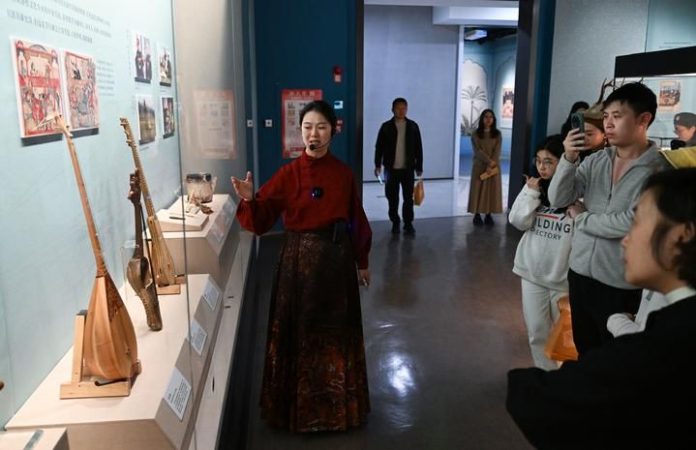 GUANGZHOU (CINA) (XINHUA/ITALPRESS) – Un membro dello staff presenta gli strumenti musicali ai visitatori durante una mostra dedicata alle diverse culture musicali lungo l’antica Via della Seta, al Museo Marittimo di Guangzhou, nella provincia cinese meridionale del Guangdong, il 29 novembre 2025.