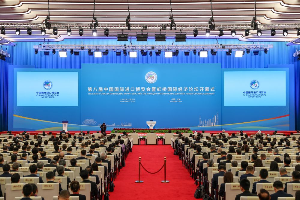SHANGHAI (CINA) (ITALPRESS/XINHUA) – Questa foto, scattata il 5 novembre 2025, mostra un momento della cerimonia di apertura dell’ottava edizione della China International Import Expo (CIIE) e dell’Hongqiao International Economic Forum a Shanghai, nella Cina orientale.