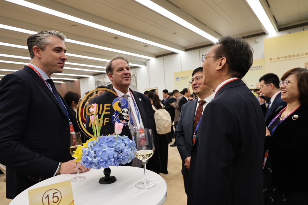 SHANGHAI (CINA) (ITALPRESS/XINHUA) – Alcuni ospiti conversano nella sede della cerimonia di apertura dell’ottava edizione della China International Import Expo (CIIE) e dell’Hongqiao International Economic Forum, a Shanghai, nella Cina orientale, il 5 novembre 2025.