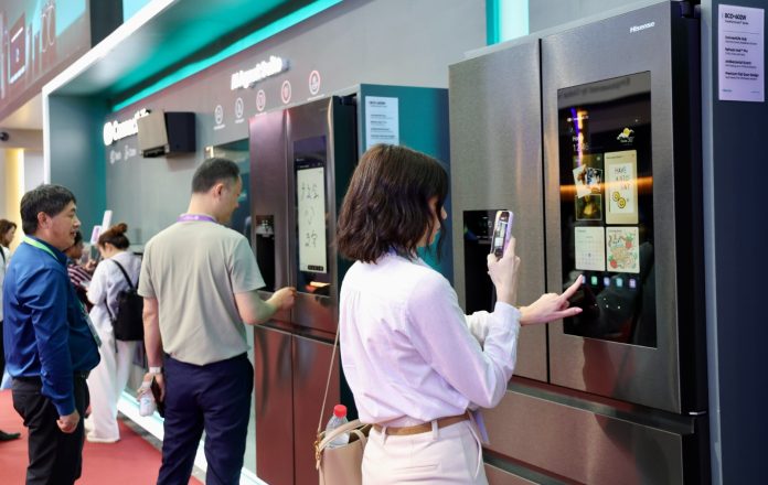 GUANGZHOU (CINA) (XINHUA/ITALPRESS) – Una visitatrice (in primo piano) si informa su un frigorifero smart durante la 139esima edizione della China Import and Export Fair a Guangzhou, nella provincia meridionale cinese del Guangdong, il 15 aprile 2026. Noto anche come Fiera di Canton, l’evento ha aperto qui oggi, attirando un numero record di oltre 32.000 imprese partecipanti. Secondo gli organizzatori, il numero delle aree espositive è salito a 179, con nove nuove sezioni dedicate a dispositivi indossabili intelligenti, tecnologie per display, droni per uso civile, case modulari e attrezzature per il giardino.