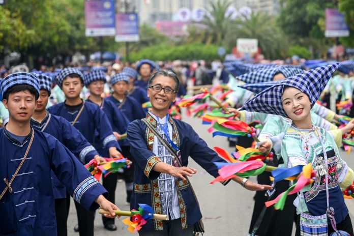 WANGMO (CINA) (XINHUA/ITALPRESS) – Alcune persone partecipano a un evento per celebrare il Sanyuesan Festival nella contea di Wangmo, nella prefettura autonoma Bouyei e Miao di Qianxinan, nella provincia sud-occidentale cinese del Guizhou, il 19 aprile 2026. Il Sanyuesan Festival è una festa tradizionale celebrata il terzo giorno del terzo mese lunare da vari gruppi etnici della Cina. Quest’anno ricorre il 19 aprile.