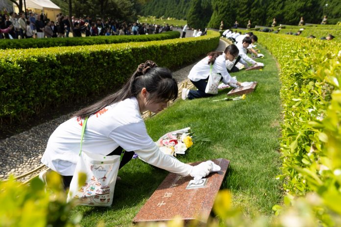 PECHINO (CINA) (XINHUA/ITALPRESS) – Degli studenti puliscono le lapidi dei martiri al Cimitero dei martiri rivoluzionari di Longhua, a Shanghai, nella Cina orientale, il 5 aprile 2026. Le persone in tutto il Paese ieri hanno preso parte a varie attività per rendere omaggio ai martiri durante la Festa di Qingming, o Giornata della pulizia delle tombe.