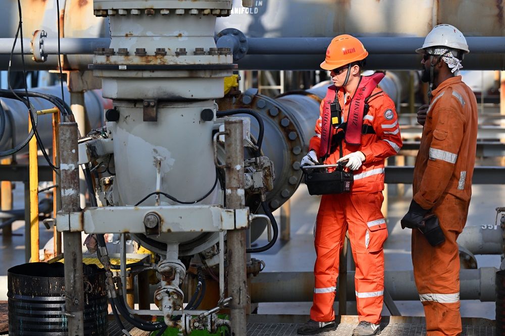HAIKOU (CINA) (XINHUA/ITALPRESS) – Un addetto portuale cinese (a sinistra) e un membro straniero dell’equipaggio al lavoro dopo l’arrivo di una nave carica di materie prime petrolchimiche al porto di Yangpu, a Danzhou, nella provincia meridionale cinese di Hainan, il 18 dicembre 2025. Giovedì la Cina ha avviato operazioni doganali speciali su tutta l’isola nel Porto di libero scambio (FTP) di Hainan. La nave, carica di materie prime petrolchimiche, è arrivata nel porto in mattinata, segnando il primo lotto di materie prime petrolchimiche a dazi zero a essere sottoposto a sdoganamento speciale dopo l’avvio delle operazioni. Le merci ammontavano a 179.000 tonnellate, con un valore complessivo di quasi 400 milioni di yuan (circa 56,8 milioni di dollari USA).