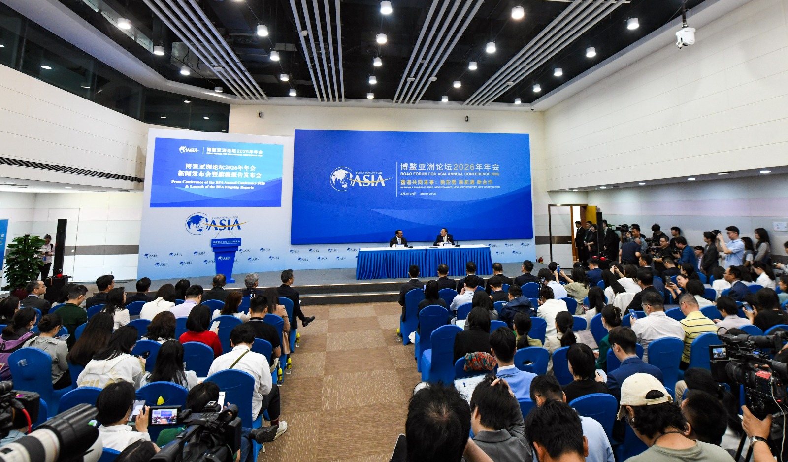BOAO (CINA) (XINHUA/ITALPRESS) – Questa foto, scattata il 24 marzo 2026, mostra una scena della conferenza stampa in occasione della conferenza annuale 2026 del Boao Forum for Asia (BFA) e della presentazione dei rapporti di punta del BFA a Boao, nella provincia meridionale cinese di Hainan. L’Asia rimane il principale motore della crescita mondiale, con un’economia che dovrebbe crescere del 4,5% nel 2026, secondo un rapporto pubblicato oggi dal BFA. In programma dal 24 al 27 marzo, l’evento di quest’anno ha come tema “Plasmare un futuro condiviso: nuove dinamiche, nuove opportunità e nuova cooperazione”.
