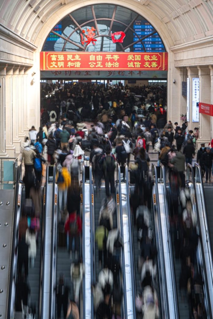 PECHINO (CINA) (XINHUA/ITALPRESS) – Dei passeggeri fanno controllare i biglietti alla stazione ferroviaria di Hankou, a Wuhan, nella provincia centrale cinese dello Hubei, il 2 febbraio 2026. Lunedì la Cina ha visto l’inizio della sua più grande migrazione annuale della popolazione, con 15 giorni di anticipo rispetto alla Festa di primavera 2026, nota anche come Capodanno cinese. Durante il periodo di punta degli spostamenti di quest’anno, che si concluderà il 13 marzo, sono previsti complessivamente 9,5 miliardi di viaggi di passeggeri, un massimo storico.