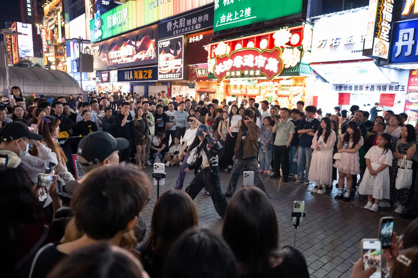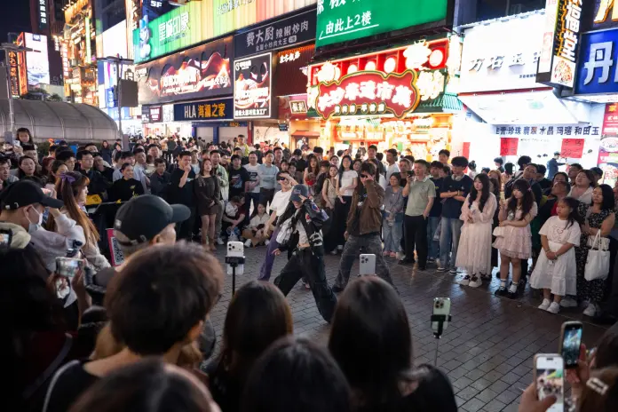 CHANGSHA (CINA) (XINHUA/ITALPRESS) – Dei turisti assistono a un’esibizione di danza trasmessa in diretta streaming in una strada pedonale di Changsha, nella provincia centrale cinese dello Hunan, il 25 aprile 2026. La città di sera offre diverse forme di attività commerciale: dalle dirette streaming alle esibizioni di band, dai servizi fotografici in costume al cibo dei mercati notturni, contribuendo alla vitalità dell’economia notturna della città.