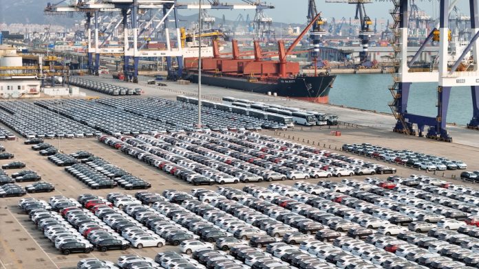 PECHINO (CINA) (XINHUA/ITALPRESS) – Una foto aerea, scattata da un drone il 14 gennaio 2026, mostra dei veicoli di produzione nazionale in attesa di essere caricati, destinati all’esportazione, nel porto di Yantai, nella provincia orientale cinese dello Shandong. Lo scorso anno il valore del commercio estero della Cina ha raggiunto 45.470 miliardi di yuan (circa 6.480 miliardi di dollari USA), in aumento del 3,8% su base annua, secondo i dati diffusi mercoledì dall’Amministrazione generale delle dogane. Si tratta del nono anno consecutivo di crescita del commercio estero cinese dal 2017.
