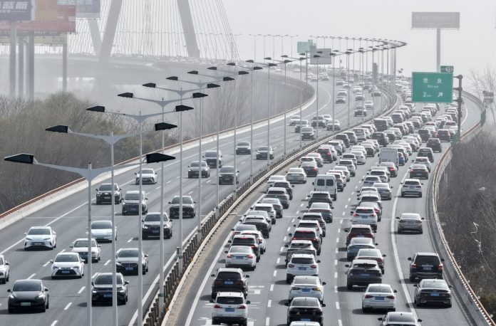 PECHINO (CINA) (XINHUA/ITALPRESS) – Una foto, scattata da un drone il 22 febbraio 2026, mostra dei veicoli sul ponte Runyang della città di Yangzhou, nella provincia orientale cinese del Jiangsu. Sabato il picco di viaggi per la Festa di primavera 2026 in Cina ha superato il giro di boa, con gli spostamenti interregionali di passeggeri che hanno raggiunto 5,08 miliardi nei primi 20 giorni, come dichiarato domenica dal ministero dei Trasporti.