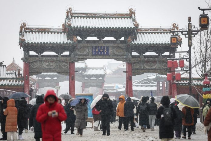SHENYANG (CINA) (XINHUA/ITALPRESS) – Delle persone camminano nella neve fuori dal Museo del Palazzo di Shenyang, nella provincia del Liaoning, nella Cina nord-orientale, il 23 dicembre 2025. Martedì una nevicata estesa ha imbiancato la provincia.