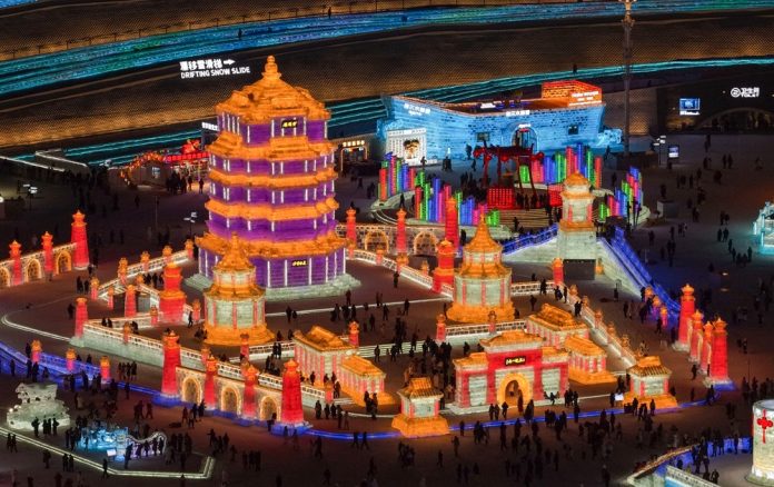 HARBIN (CINA) (XINHUA/ITALPRESS) – Una foto aerea, scattata da un drone il 5 gennaio 2026, mostra una veduta dell’Harbin Ice-Snow World, nell’omonima città della provincia nord-orientale cinese dello Heilongjiang. La 42esima edizione del Festival internazionale del ghiaccio e della neve di Harbin ha preso il via qui lunedì.