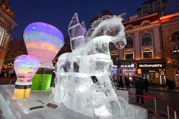 HARBIN (CINA) (XINHUA/ITALPRESS) – Dei turisti visitano la Central Street di Harbin, nella provincia nord-orientale cinese dello Heilongjiang, il 15 gennaio 2026. Questa via centenaria è stata trasformata in un luccicante paese delle meraviglie invernale grazie all’aggiunta di decine di sculture di ghiaccio, attirando un grande afflusso di gente del posto e turisti.