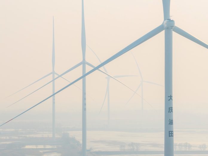 DAQING (CINA) (XINHUA/ITALPRESS) – Una foto, scattata da un drone il 25 marzo 2026, mostra impianti per la produzione di energia eolica nella zona dimostrativa a basse emissioni di carbonio del giacimento di Lamadian a Daqing, nella provincia dello Heilongjiang, nella Cina nord-orientale. Trattandosi di un’importante base di produzione energetica della Cina, il giacimento ha esplorato negli ultimi anni nuovi percorsi per la trasformazione e lo sviluppo ecologici. Pur mantenendo stabile la produzione di energia tradizionale, ha promosso attivamente la costruzione di progetti di energia fotovoltaica, eolica e geotermica.