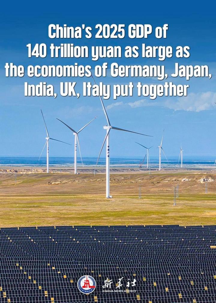 L’economia cinese ha continuato a crescere. Nel 2025 il PIL ha superato i 140.000 miliardi di yuan (circa 20.160 miliardi di dollari Usa), un valore equivalente alla somma delle economie di Germania, Giappone, India, Gran Bretagna e Italia. In quanto economia di dimensioni così grandi, questa scala fornisce alla Cina una solida base per resistere ai rischi e mantenere uno slancio positivo di lungo periodo.