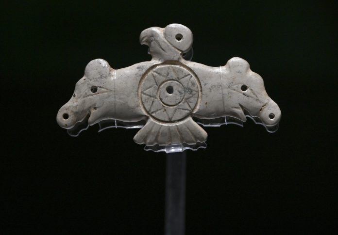 MA’ANSHAN (CINA) (XINHUA/ITALPRESS) – Questa foto, scattata il 16 maggio 2025, mostra un’aquila di giada esposta al Museo del sito di Lingjiatan, nella contea di Hanshan, a Ma’anshan, nella provincia orientale cinese dell’Anhui. Datato a circa 5.300-5.800 anni fa, il sito di reperti di Lingjiatan è stato scoperto nel 1985 ed è noto per i manufatti in giada rinvenuti nell’area. I ritrovamenti comprendono oggetti in giada di varie forme, che offrono uno sguardo sulla spiritualità e sull’estetica di una cultura preistorica cinese della giada.