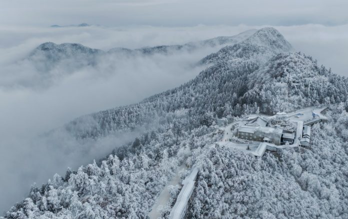 HENGYANG (CINA) (XINHUA/ITALPRESS) – Questa foto aerea, scattata da un drone il 22 gennaio 2026, mostra il paesaggio imbiancato del sito panoramico del monte Hengshan, nella città di Hengyang, nella provincia centrale cinese dello Hunan.