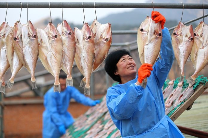 JINAN (CINA) (XINHUA/ITALPRESS) – Una donna essicca il pesce nel distretto di Jimo a Qingdao, nella provincia orientale cinese dello Shandong, il 6 gennaio 2026.