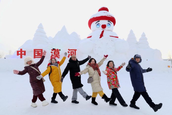 HARBIN (CINA) (XINHUA/ITALPRESS) – Dei turisti si mettono in posa per delle foto davanti a un gigantesco pupazzo di neve nei pressi della stazione ferroviaria di Mohe, nella provincia dell’Heilongjiang, nella Cina nord-orientale, il 16 gennaio 2026. Con l’arrivo della stagione invernale, varie strutture pubbliche della provincia hanno realizzato paesaggi caratteristici incentrati sui pupazzi di neve per attirare residenti e turisti.