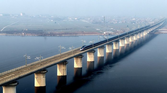 PECHINO (CINA) (XINHUA/ITALPRESS) – Una foto, scattata da un drone il 25 gennaio 2026, mostra un treno proiettile in transito nella contea di Pingyi, città di Linyi, nella provincia orientale cinese dello Shandong. Dal 26 gennaio 2026, in Cina, è entrato in vigore il nuovo orario ferroviario.