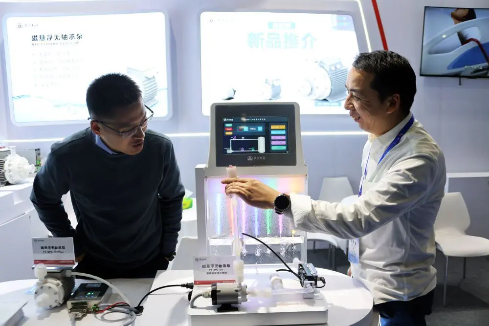 PECHINO (CINA) (XINHUA/ITALPRESS) – Un espositore illustra il principio di funzionamento della pompa a levitazione magnetica senza cuscinetti durante la 22esima Expo internazionale cinese dei semiconduttori a Pechino, capitale della Cina, il 23 novembre 2025. L’esposizione ha aperto i battenti domenica.