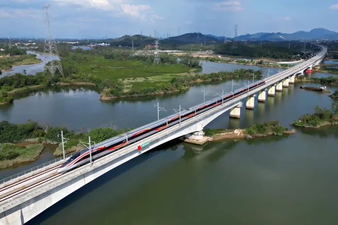 GUANGZHOU (CINA) (XINHUA/ITALPRESS) – Un treno proiettile percorre un ponte lungo la ferrovia ad alta velocità Guangzhou-Zhanjiang, nella provincia meridionale cinese del Guangdong, il 22 dicembre 2025. Lunga circa 401 chilometri, la ferrovia è entrata in funzione lunedì. Con una velocità massima progettata di 350 chilometri orari, il tempo di percorrenza tra la stazione ferroviaria Baiyun di Guangzhou e la stazione ferrovaria di Zhanjiang Nord, entrambe nel Guangdong, può essere ridotto a circa un’ora e mezza.