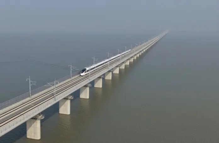 HEFEI (CINA) (XINHUA/ITALPRESS) – Una foto, scattata da un drone il 30 dicembre 2025, mostra un treno in transito su un ponte che attraversa il fiume Huaihongxin, lungo la ferrovia ad alta velocità Hefei-Xinyi, nella provincia orientale cinese dell’Anhui. Il tratto Hefei-Sixian della ferrovia ad alta velocità Hefei-Xinyi è stato ufficialmente messo in funzione martedì, segnando l’apertura di un’ulteriore linea veloce per passeggeri tra la città di Hefei e l’Anhui orientale.
