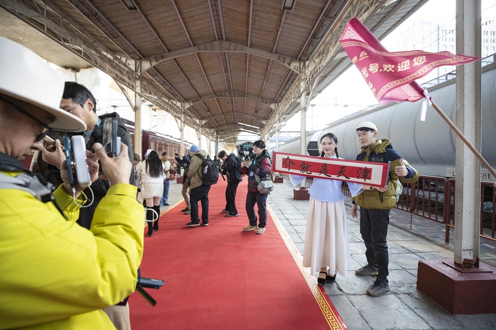 PECHINO (CINA) (XINHUA/ITALPRESS) – Un turista (il primo da destra) posa con un’artista alla stazione ferroviaria di Tianjin Nord a Tianjin, nella Cina settentrionale, il primo gennaio 2026. A partire da giovedì, il Tianjin Fantasy Express ha inaugurato un servizio pianificato di andata e ritorno tra la stazione ferroviaria di Pechino a quella di Tianjin Nord. La linea presenta dieci carrozze con temi distintivi che integrano spettacoli artistici, presentazioni culturali ed esperienze di patrimonio culturale immateriale.