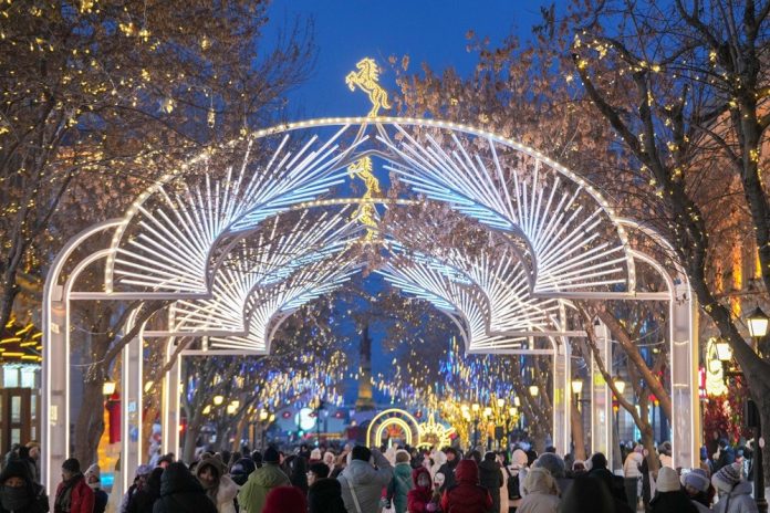 HARBIN (CINA) (XINHUA/ITALPRESS) – Delle persone visitano la Central Street di Harbin, nella provincia nord-orientale cinese dello Heilongjiang, l’8 gennaio 2026. Una delle attrazioni più popolari di Harbin, la Central Street, rinomata per la sua architettura diversificata in stile europeo, incanta i turisti di notte con le sue luci colorate, durante la forte crescita del turismo in città questo inverno.