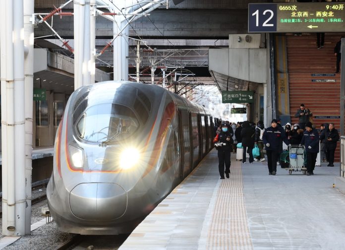 PECHINO (CINA) (XINHUA/ITALPRESS) – Un treno ad alta velocità si ferma su un binario della Stazione ferroviaria di Pechino Ovest a Pechino, capitale della Cina, il 21 gennaio 2026. La stazione mercoledì ha celebrato il suo 30esimo anniversario. Negli ultimi tre decenni, questo moderno snodo dei trasporti ha gestito oltre 1,96 miliardi di viaggi di passeggeri, diventando testimone dello sviluppo della Cina e dell’evoluzione della sua rete ferroviaria.
